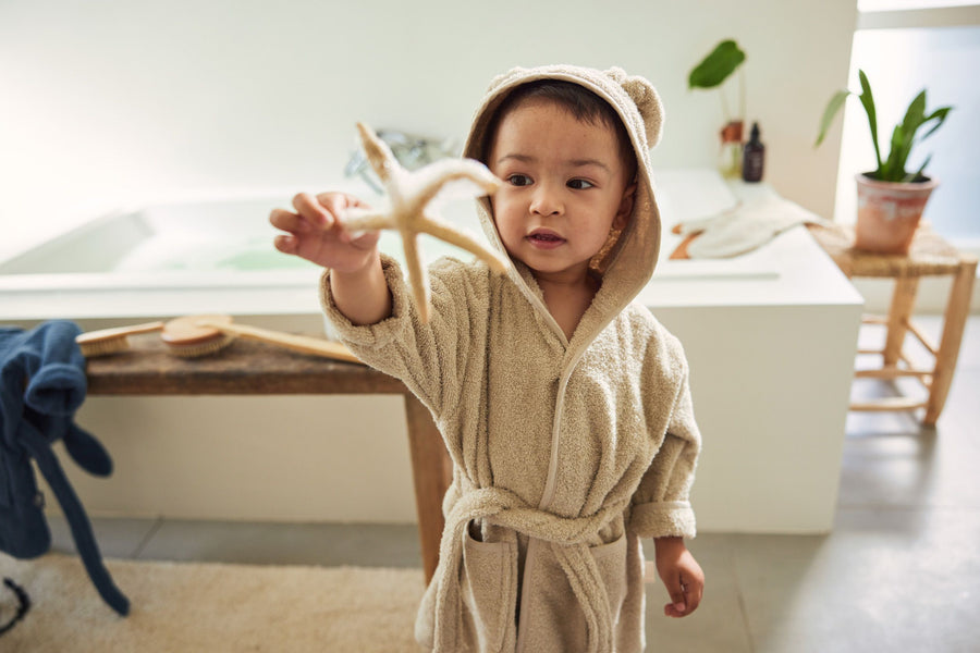 Hægt er að nota baðsloppinn frá 1 árs aldri og hann ætti að passa til um 2 ára aldurs. Þetta fer að sjálfsögðu líka eftir stærð barnsins. Sloppurinn er með smellu til að halda honum saman að framan, teygju að aftan og bönd sem eru föst við sloppinn svo þau týnist ekki.