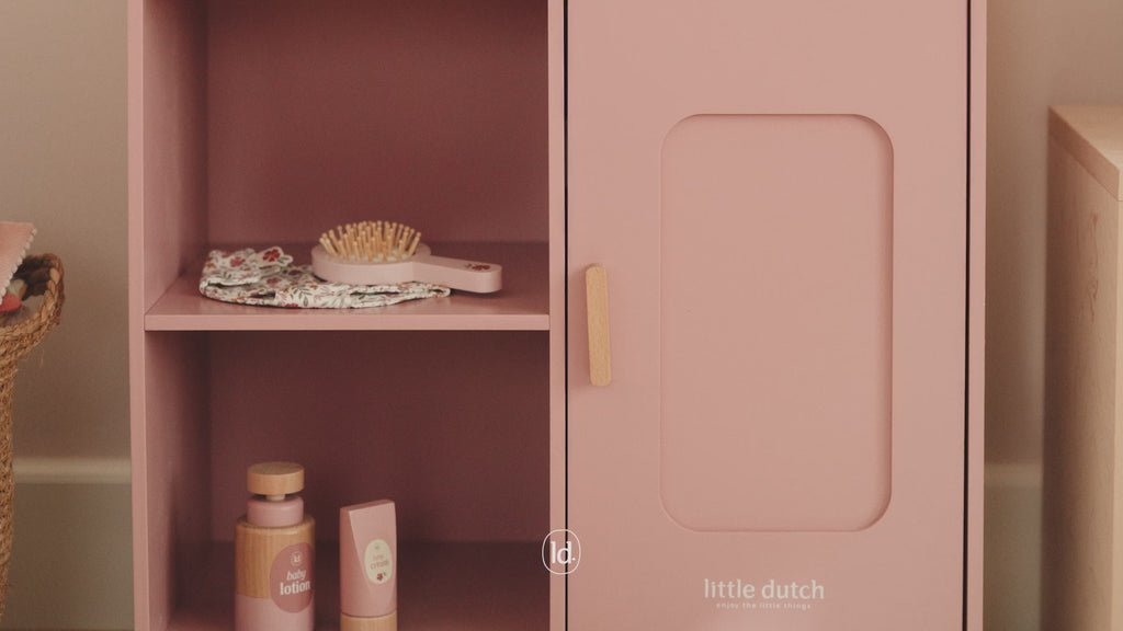 This beautiful doll changing table offers everything you need to lovingly care for your doll. The set includes a mobile, a wonderfully soft changing mat with the dreamy Soft Flowers design, and various wooden care accessories. Additionally, the changing table includes a diaper, a sleeping bag, and cute clothes hangers to neatly store your doll's outfits. The cabinet provides extra storage space for all necessities, ensuring your doll is always well cared for.