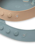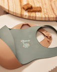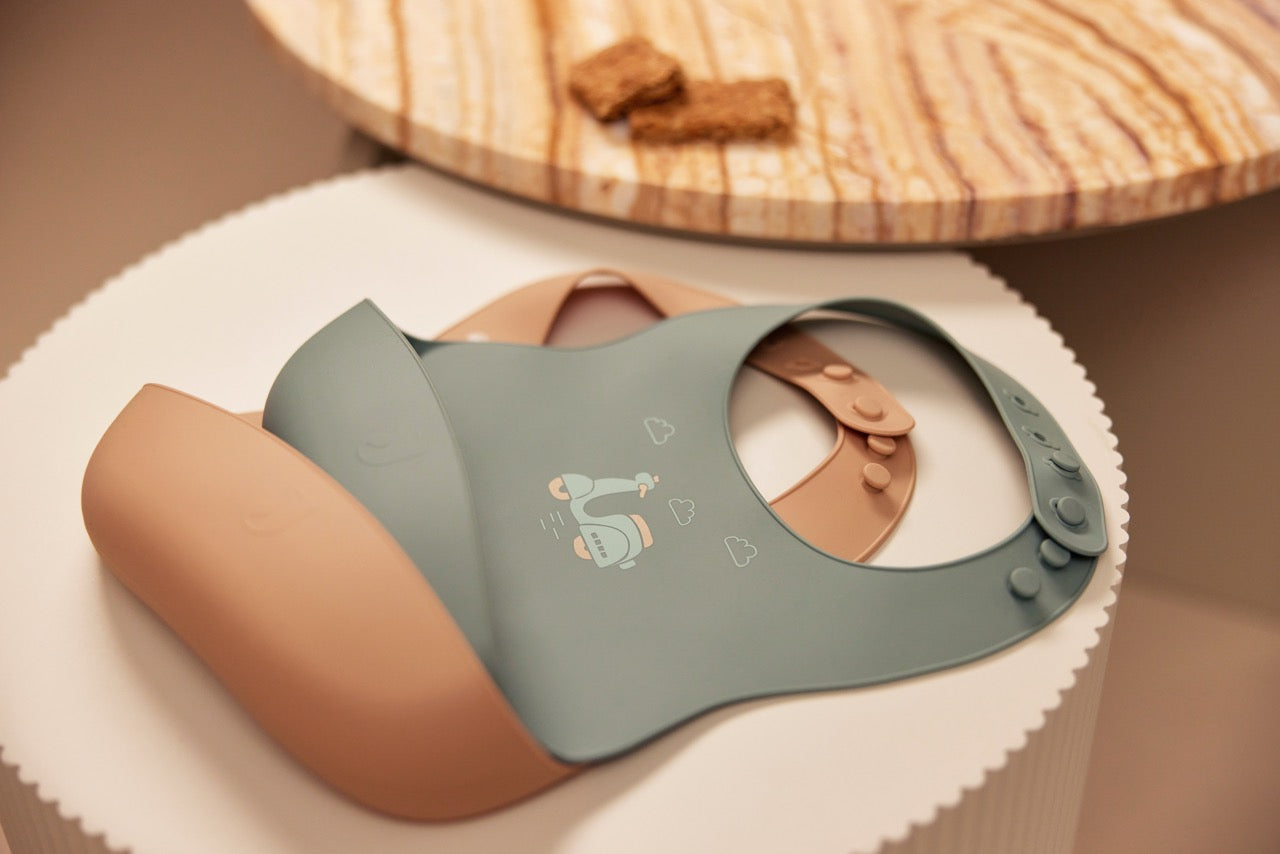 Með sílikon smekknum geta börn æft sig að borða sjálf án þess að allt leki í fötin. Smekkurinn er með hólfi sem grípur auka bita sem dettur niður þegar börnin mata sig. Má setja í uppþvottavél.