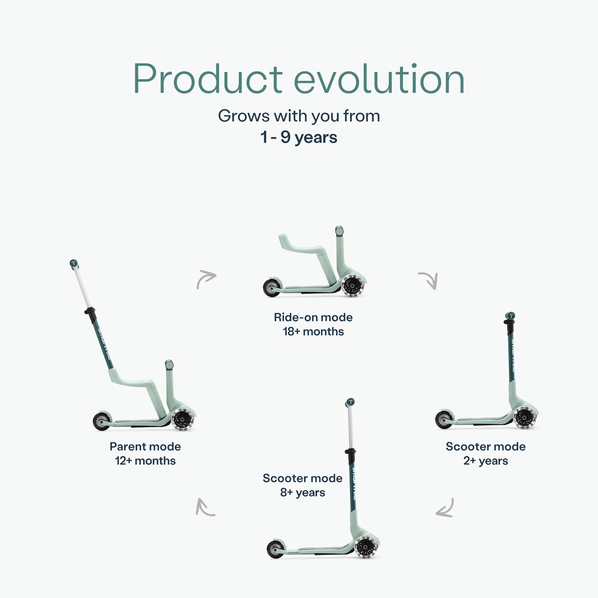 - Multi-Stage Design transitioning from ride-on for toddlers to a full scooter for older kids.