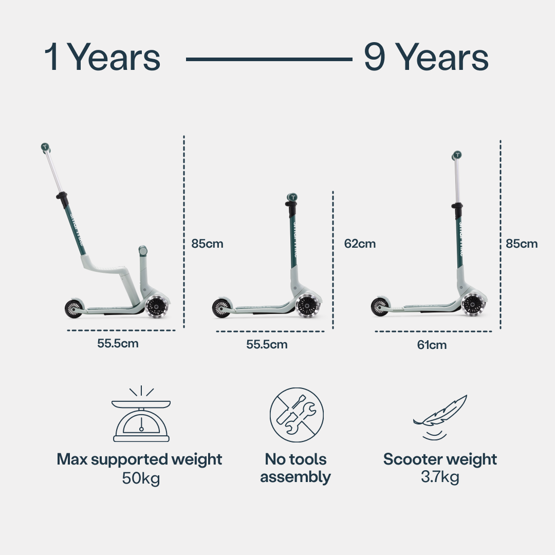 The Xtend Mini-ride grows with your child from 12 months to 9 years, transforming seamlessly from a ride-on to a scooter. With an extendable footboard and LED wheels, it’s designed for years of active, fun adventures.