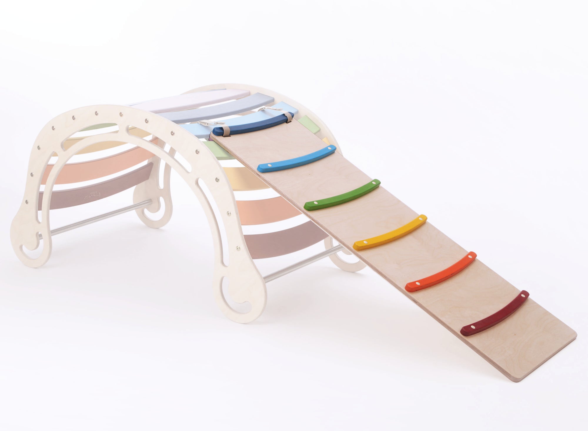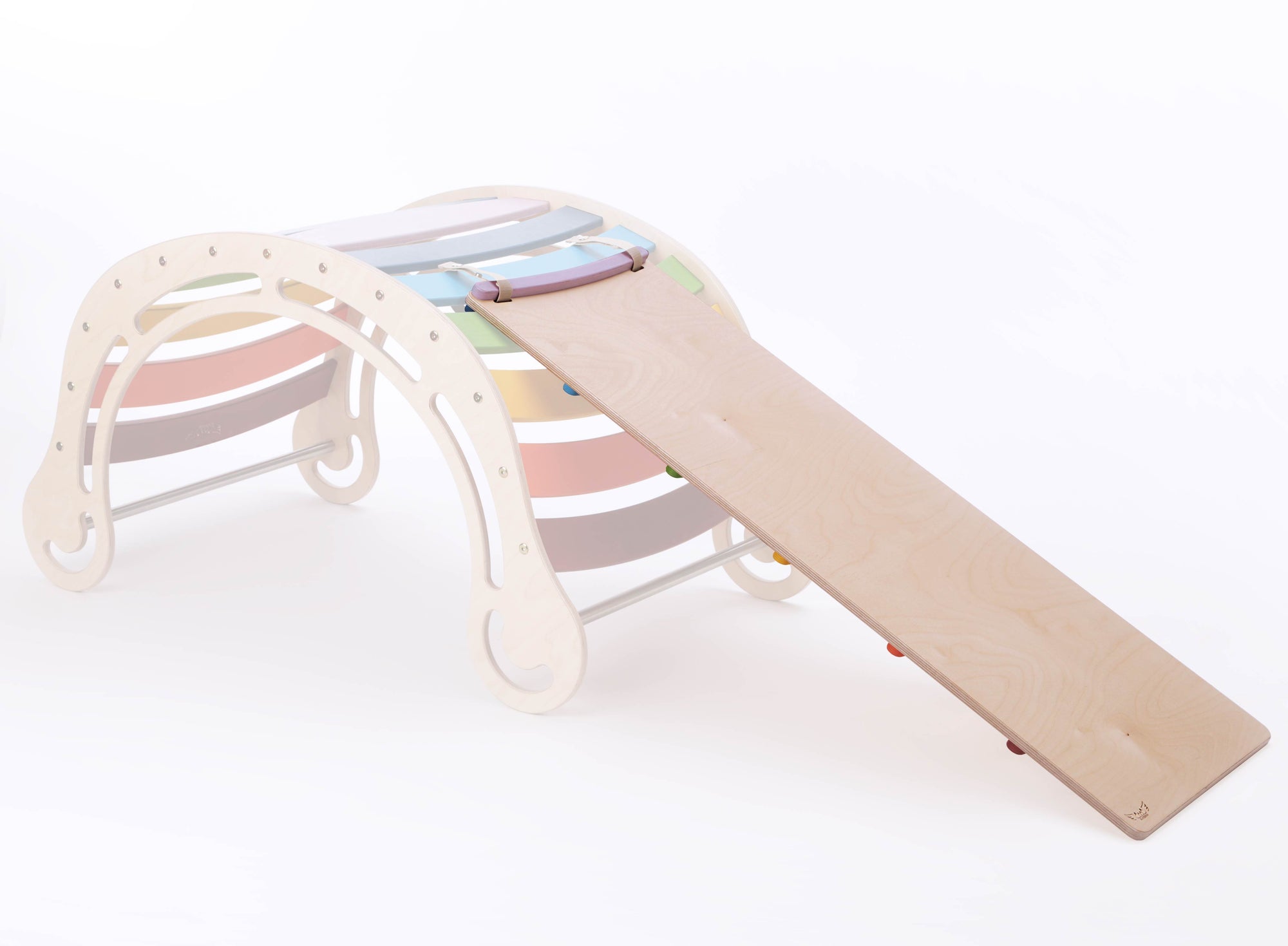Uppfærðu klifurbogann fyrir skemmtilegri og virkari leik með klifur- og rennibraut. Rampurinn er með tveimur hliðum, einni með stiga til að klifra og einni til að renna. Fyrir enn meiri spennu er einnig hægt að hafa tvo rampa fasta við klifurbogann.